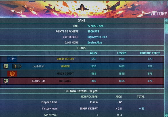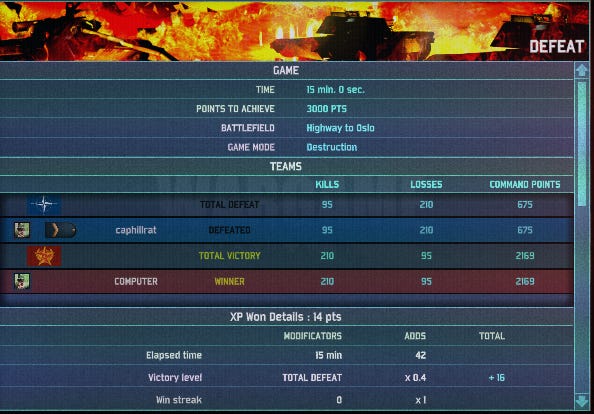 Over the next seven minutes, more compact Soviet forces make mincemeat of TF Beowulf, and at the end of 15 minutes I have suffered a “Total Defeat.”