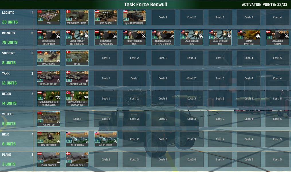 My Beowulf battlegroup consisting of almost two battalions of infantry (1 Dane and 1 American), a heavy dose of anti-air capability supported by American helos and Danish fighter jets are ready to take on a random group of Pact forces. I really don’t know if my deck is balanced or anywhere near historically accurate, but I am going to try to find the best strategy for the deck and for this game by playtesting it at least three times.