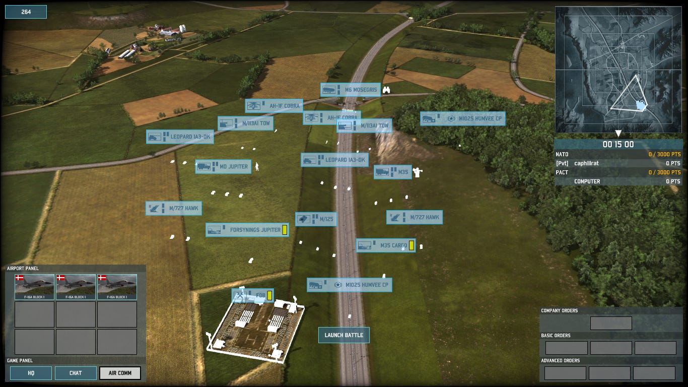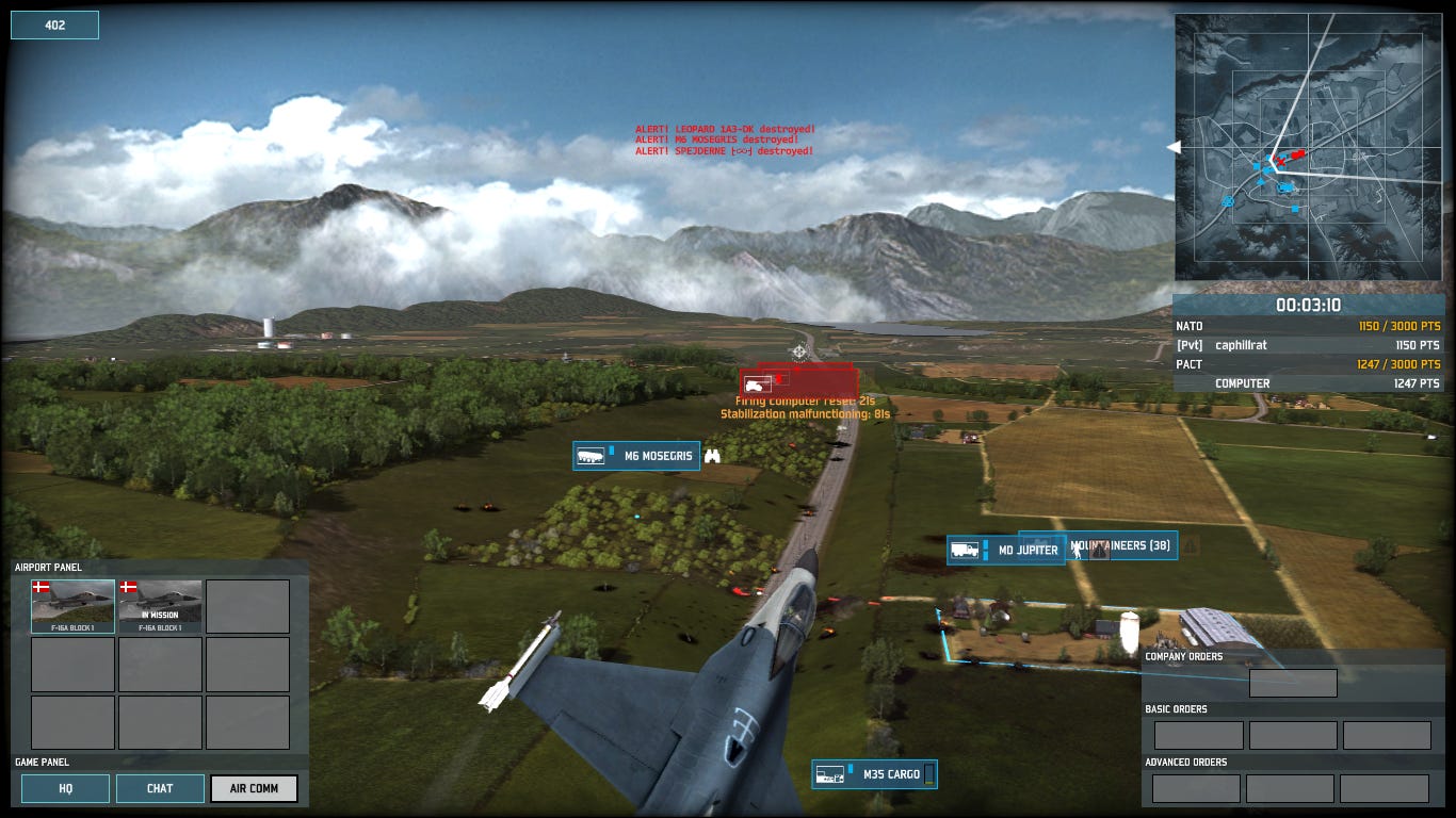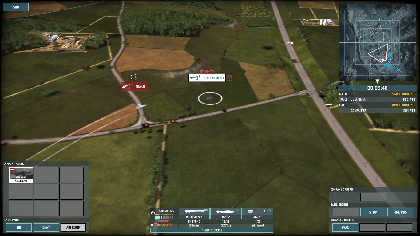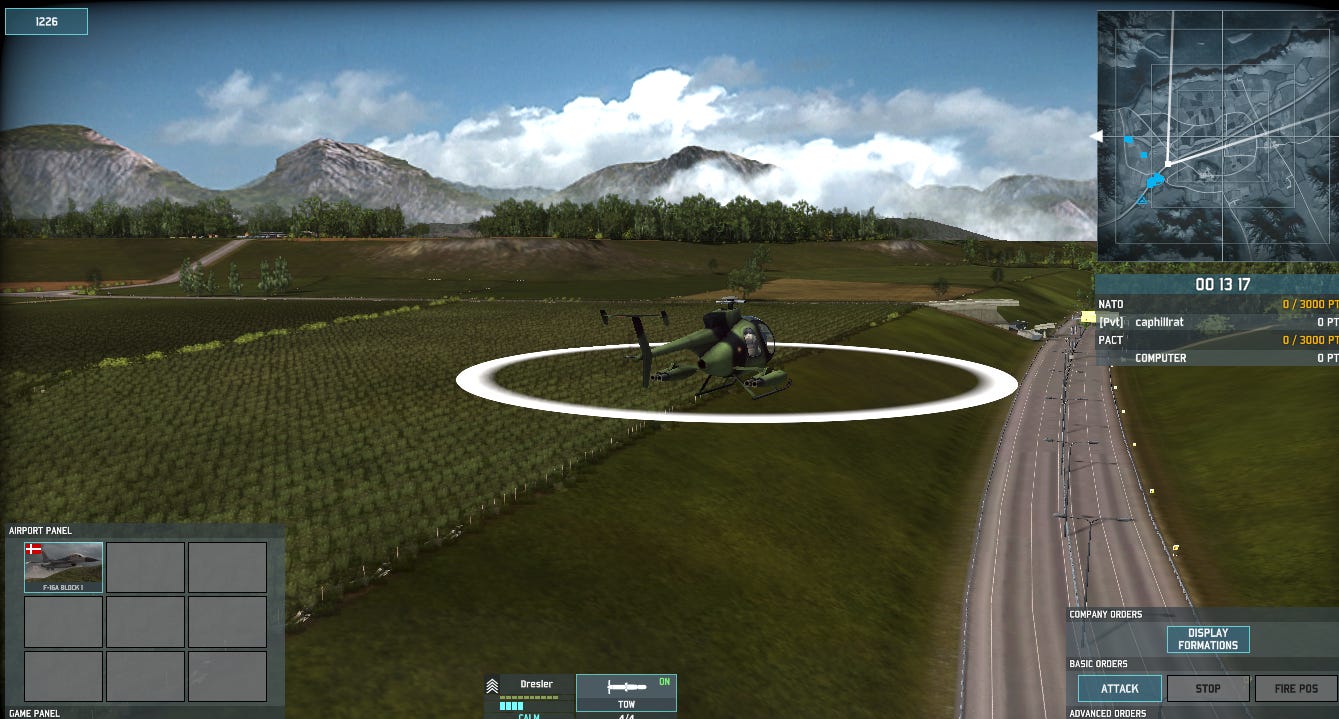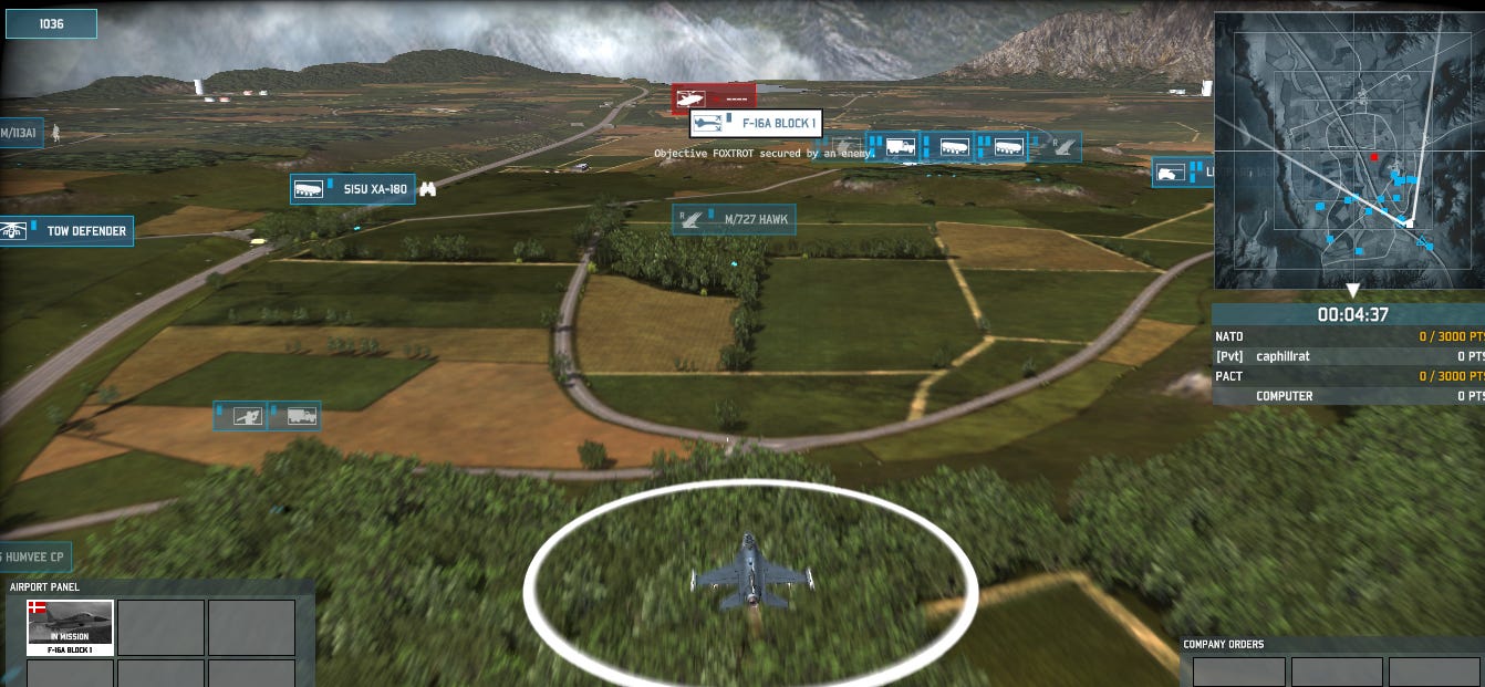 Having established what I think are strong positions along my frontline and plenty of coverage by my recon units, the first casualty to my Danish F-16 is a Soviet recon helicopter.