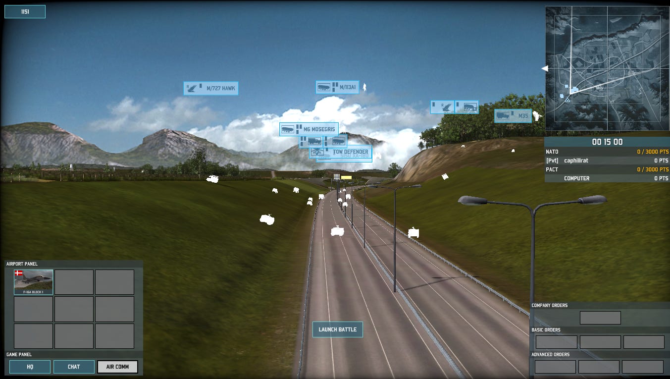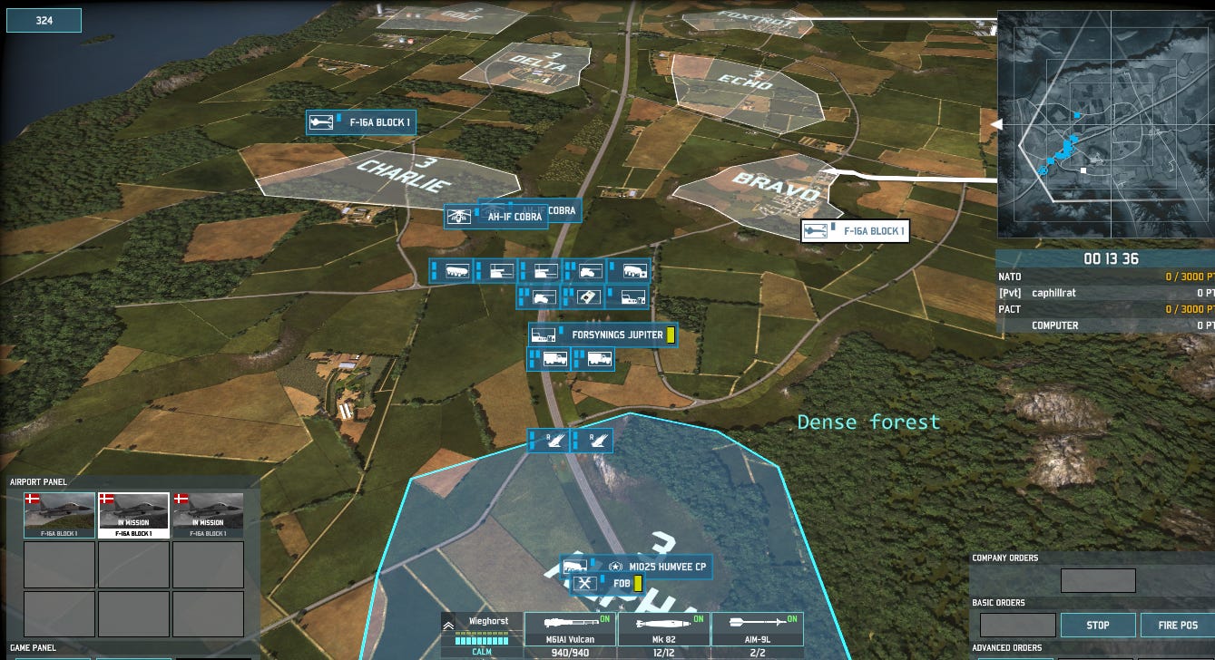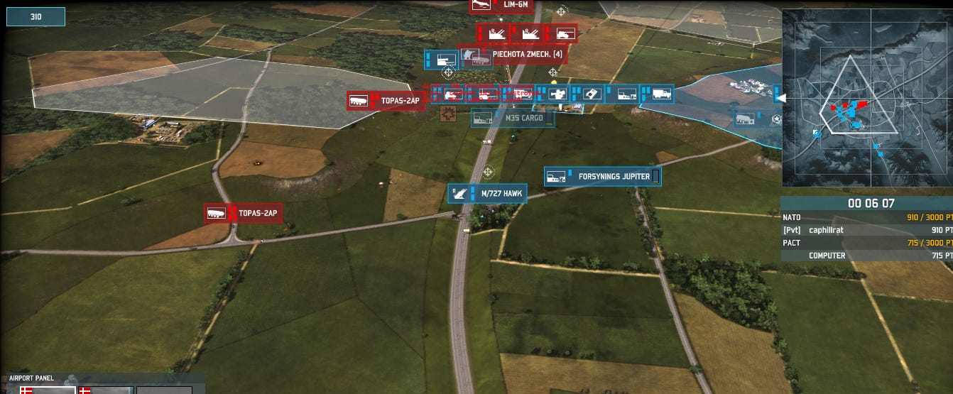 Danish F-16s are up over the battlefield as I advance up the E6 highway towards Oslo. Once I establish a defensive position between the Charlie and Bravo objectives, I am going to place a command vehicle in Bravo, because that will give me more activation points and open a shorter route to the battlefield for reinforcements.